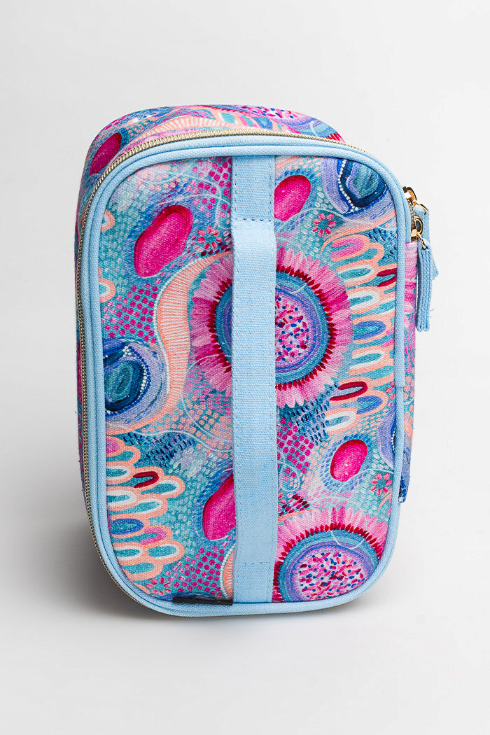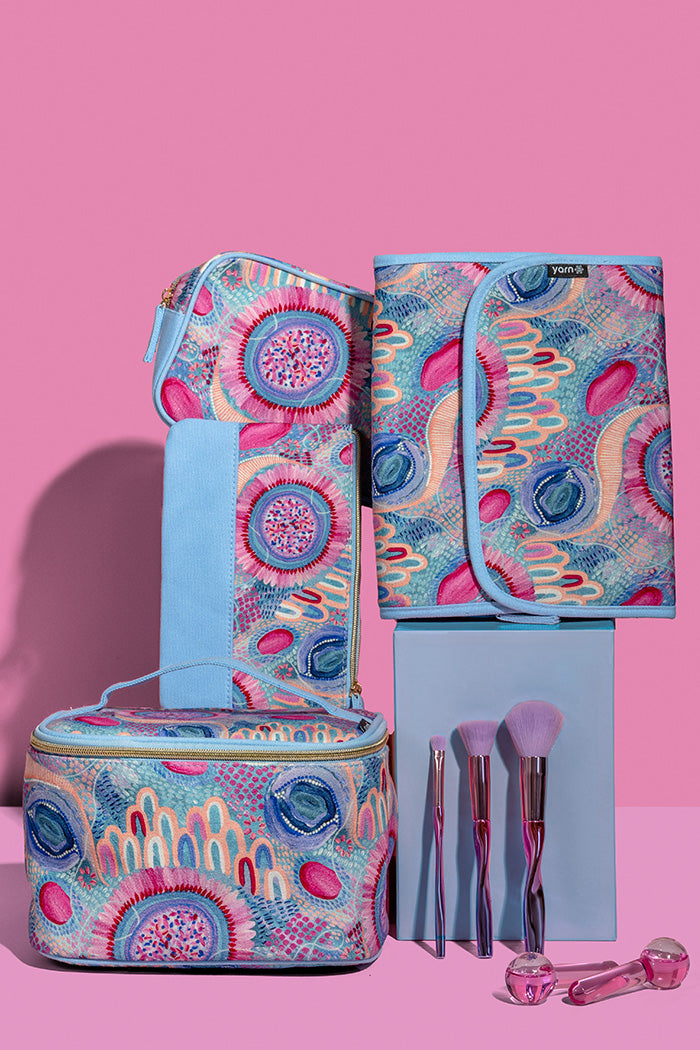 Brighten up your station, bathroom or hotel room with a burst of vibrant First Nations art. Collect the set or mix and match from the three landscape-inspired designs. With storage compartments and a carry handle, these cosmetics bags are both pretty and practical.